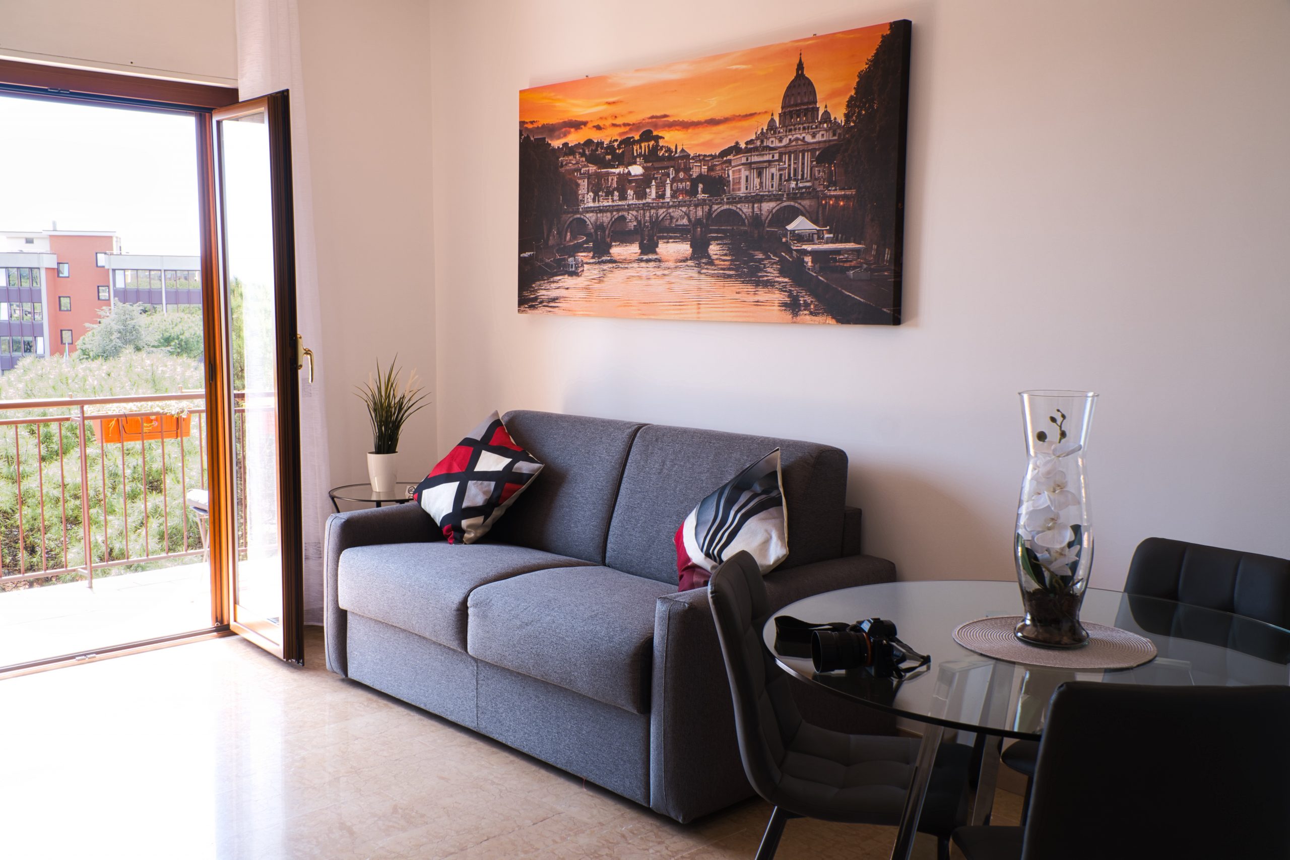 Ideal para hasta 5 huéspedes, este moderno y luminoso piso combina comodidad, privacidad y una ubicación privilegiada junto a la Villa Pamphilj. Dispone de un dormitorio con cama king-size, salón con sofá cama y sillón cama, además de terraza privada con vistas.